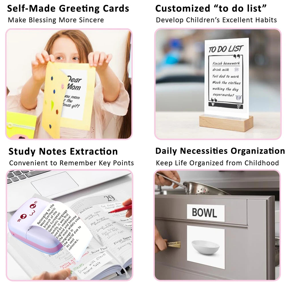 Features:Advanced thermal printing technology, no ink cartridge, convenient and cost saving.Built-in 1000mAh rechargeable batterys, working in low noise, the thermal printer does not need ink cartridge when using, low operation cost.200dpi high resolution printing head, clear print and stable performance.Support multiple functions, it can print photos, labels, messages, lists, records, QR Code, web printing and so on. The APP offers a variety of fonts and themes to make your photos stylish.Record your life, print the scenery you see, record his or her sweet words, collect the exercises you have done wrong, fun and practical.Lightweight and compact size, easy to carry.