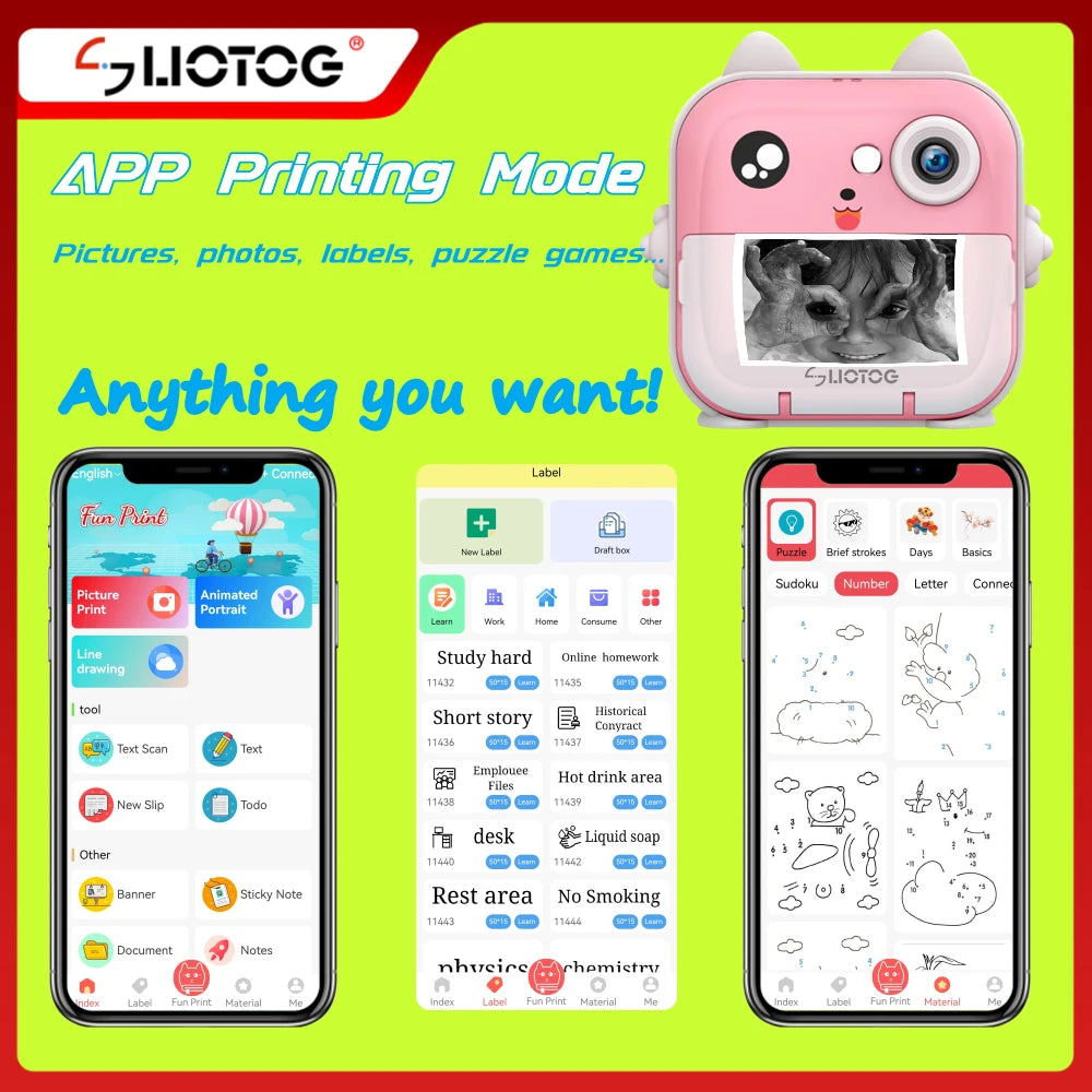 【Creative Instant Print Camera Special Designed for Kids】This kids digital camera with an instant printing function, you can obtain color photos store in SD Card while quickly printing black and white photos, our kids cameras are equipped with 2 print modes, grayscale and dot matrix printing, and 3 types of color depth printing. With Advanced thermal printing technology, no toner and BPA, it is very safe to kids. It helps Recording your child's happy growth, develop kids imagination and creativity, enhance the fun of parent-child interaction.