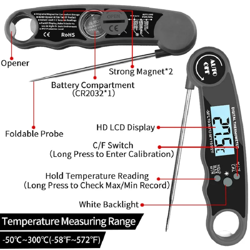 So easy to Use & Multi Function - Works right out the box! The digital thermometer is pre-calibrated, so you don't need to calibrate by yourself. With Auto On/Off function, you can unfold the probe to turn on or fold to turn off. Press the ℃/℉ button to switch the temperature between Centigrade and Fahrenheit. The digital meat thermometer not only comes with a large digital LCD backlight screen, but also has Hold Button which lets you see the temp easier.