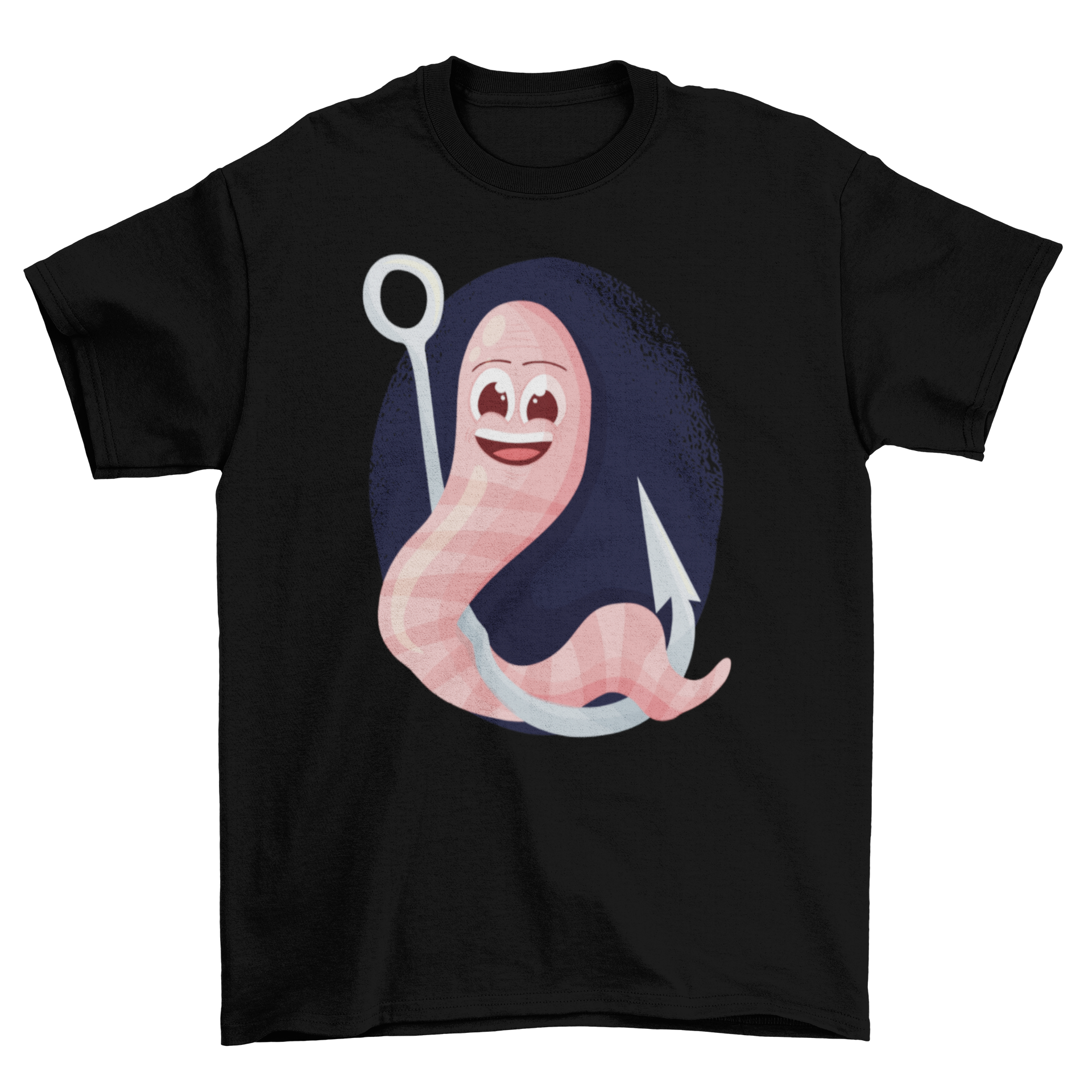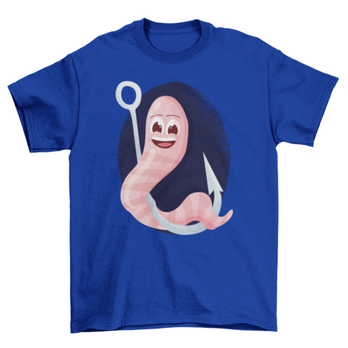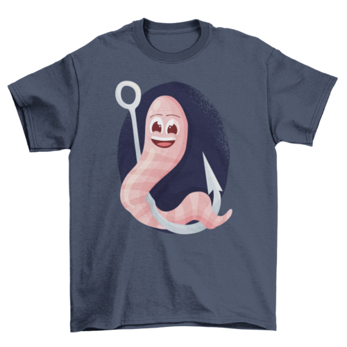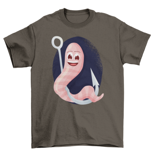 Cute fishing theme t-shirt design featuring smiling fishing bait worm wind around fishing hook over grunge ellipse backdrop. Read more