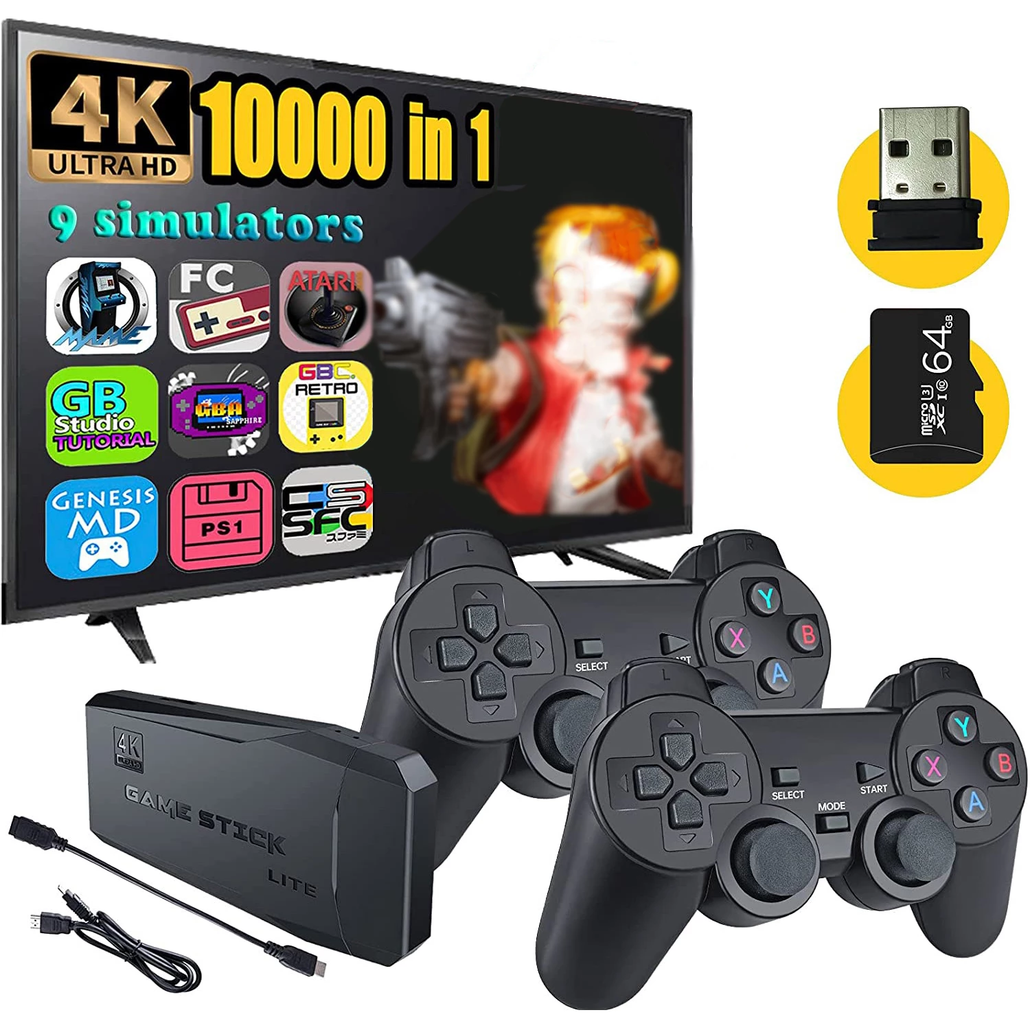 【Upgrated - High Performance Game Chip】Hawiton wireless TV game console built in 10000+ rich games, is pre-install 10 emulators, and pack with 64GB TF card. Not only that, but also use upgraded game chip, more powerful, Support 8-bit, 16-bit, 32-bit, 64-bit, 128-bit and other emulators. Perfectly meet your needs for picture quality and game fluency, must worth the price.