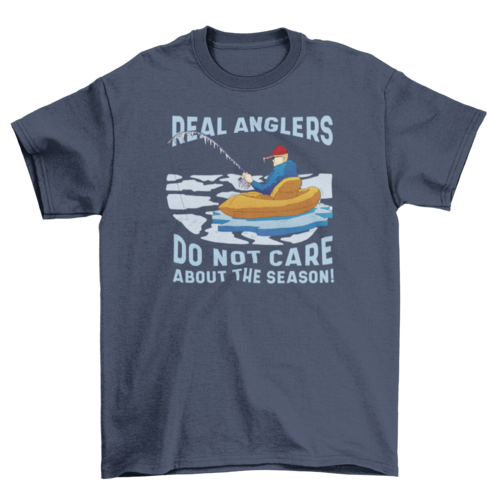 Amazing t-shirt design featuring a man fishing on a frozen lake with the quote "Real anglers do not care about... Read more